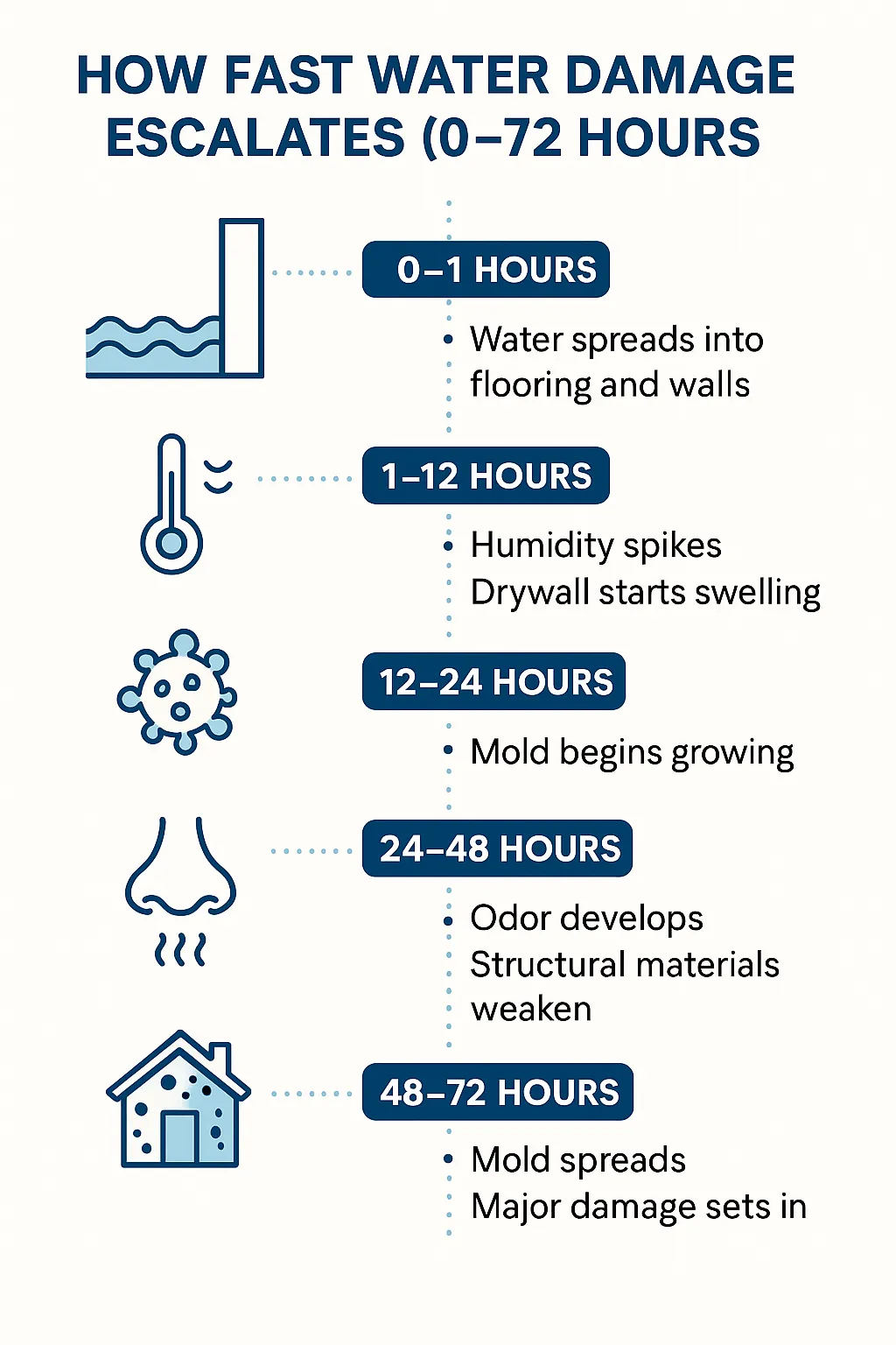 Time directly impacts water damage severity. The longer moisture sits, the deeper it penetrates.