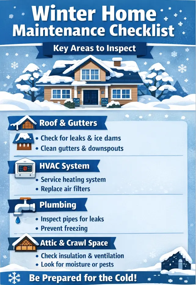 Illustrated checklist showing roof and gutter maintenance tasks for homes in Upstate South Carolina during winter.