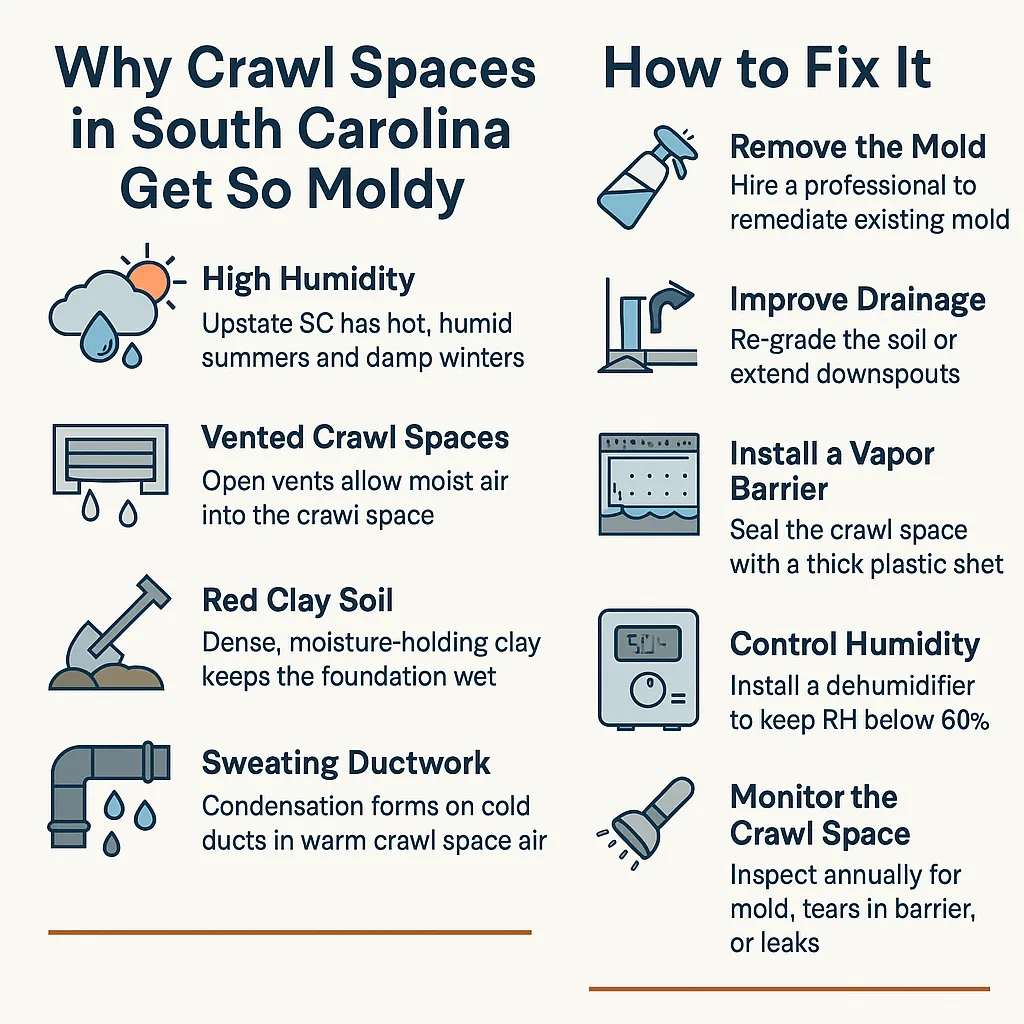 An infographic showing my crawl spaces in South Carolina get moldy and how to fix it.